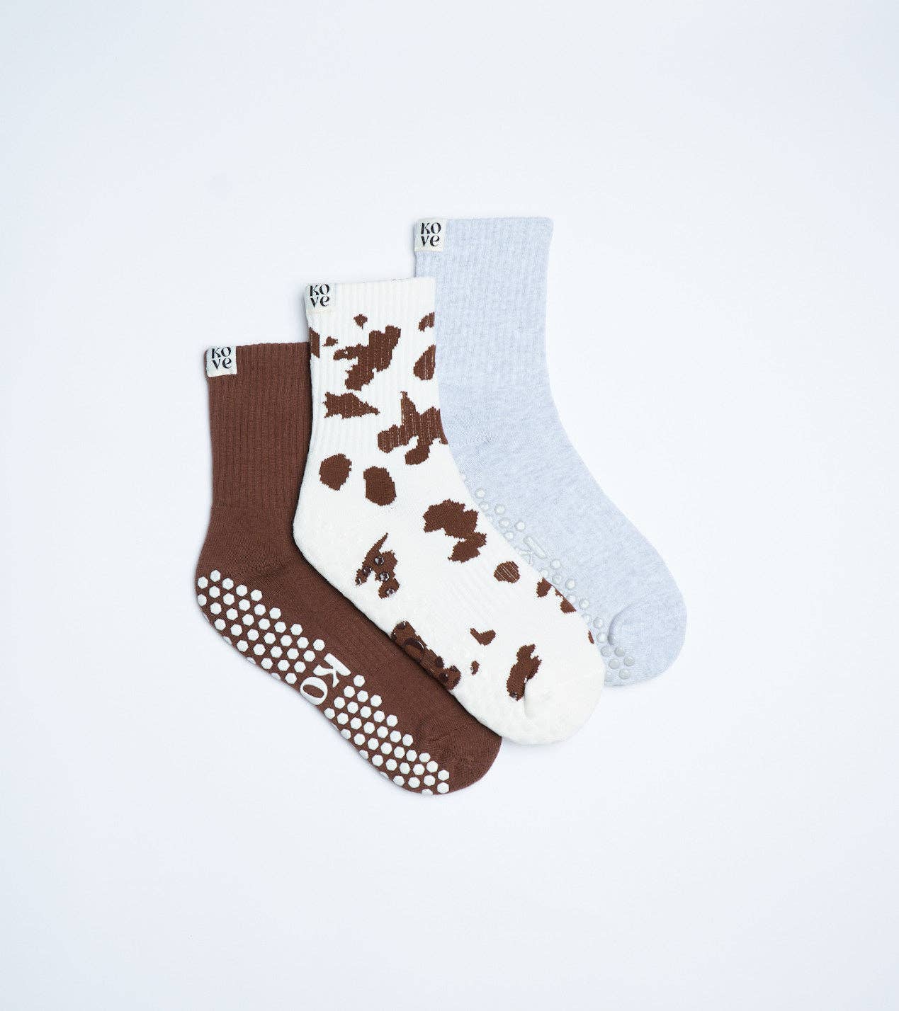 Step into comfort and style with Kove's Cow Print - Grip Socks. Trusted by instructors and loved by clients, these premium Pilates grip socks are designed for performance, comfort, and refined style. They provide lasting grip and are made from quality materials. The polished aesthetic of our socks makes them a fashionable addition to any Pilates class. Plus, with our inclusive sizing, they're perfect for everyone. Elevate your Pilates experience with Kove.